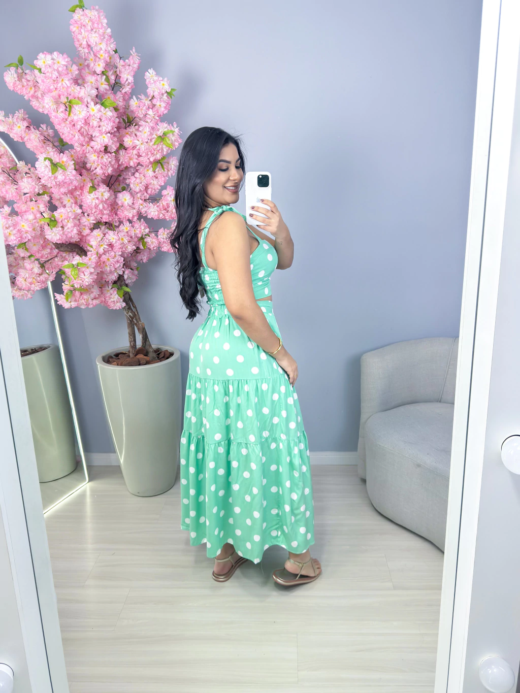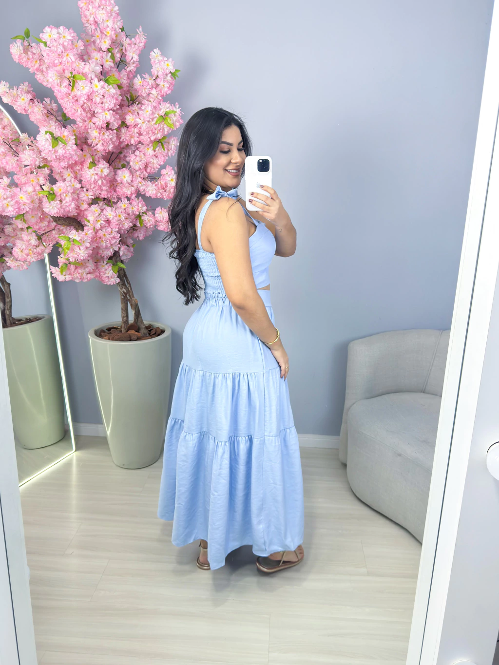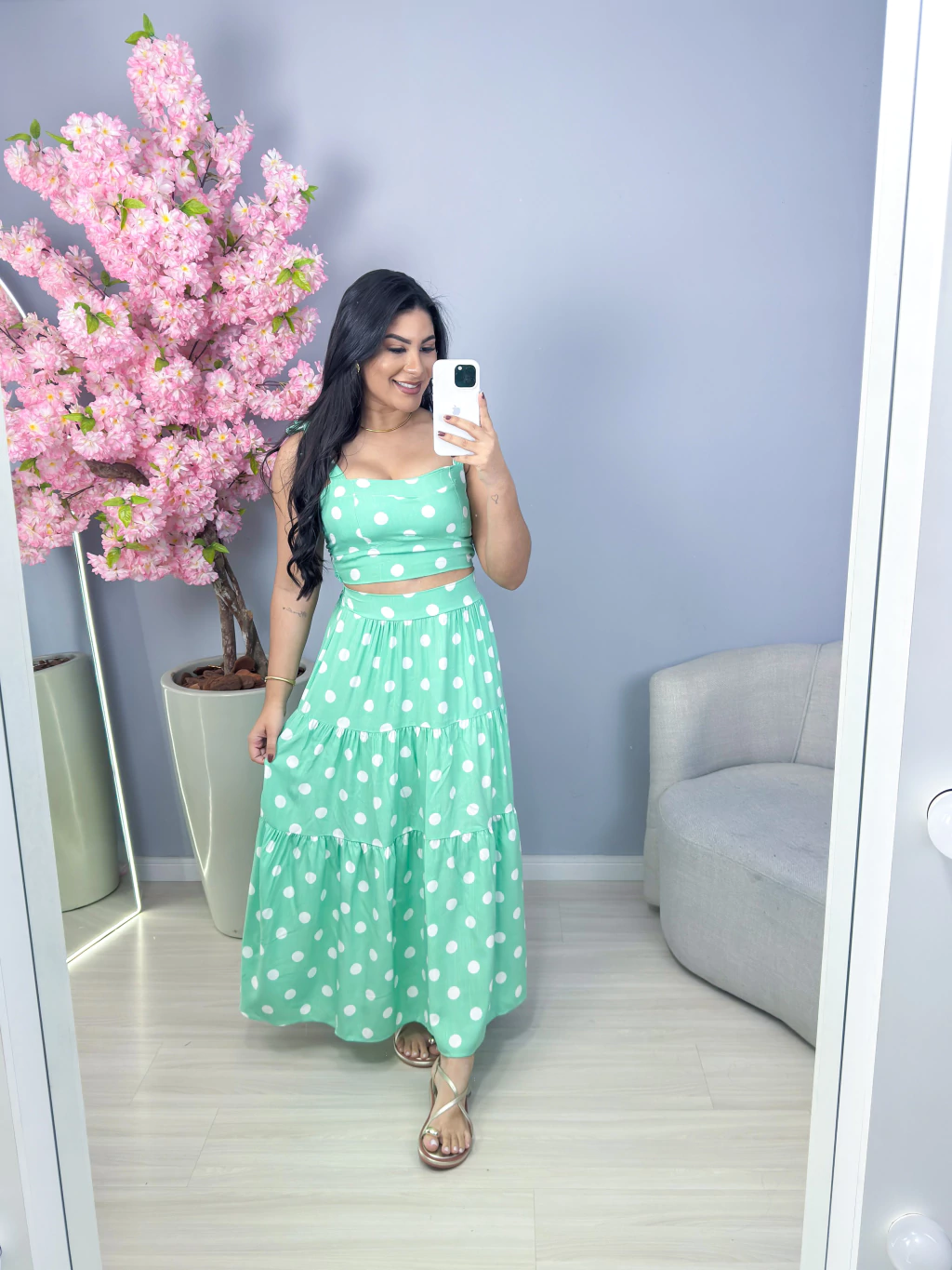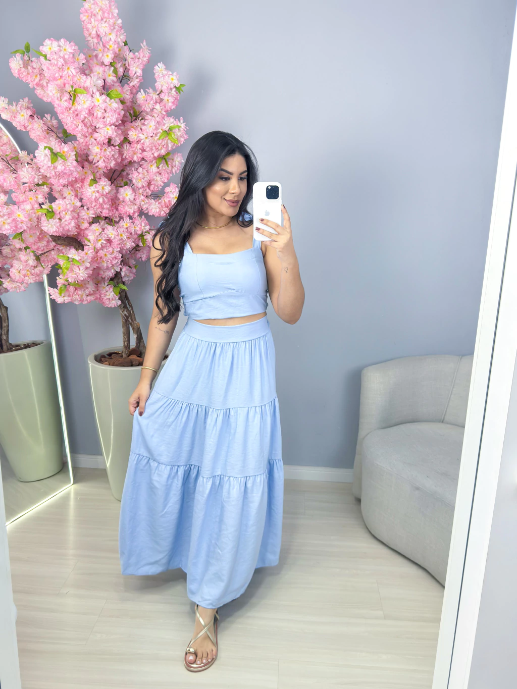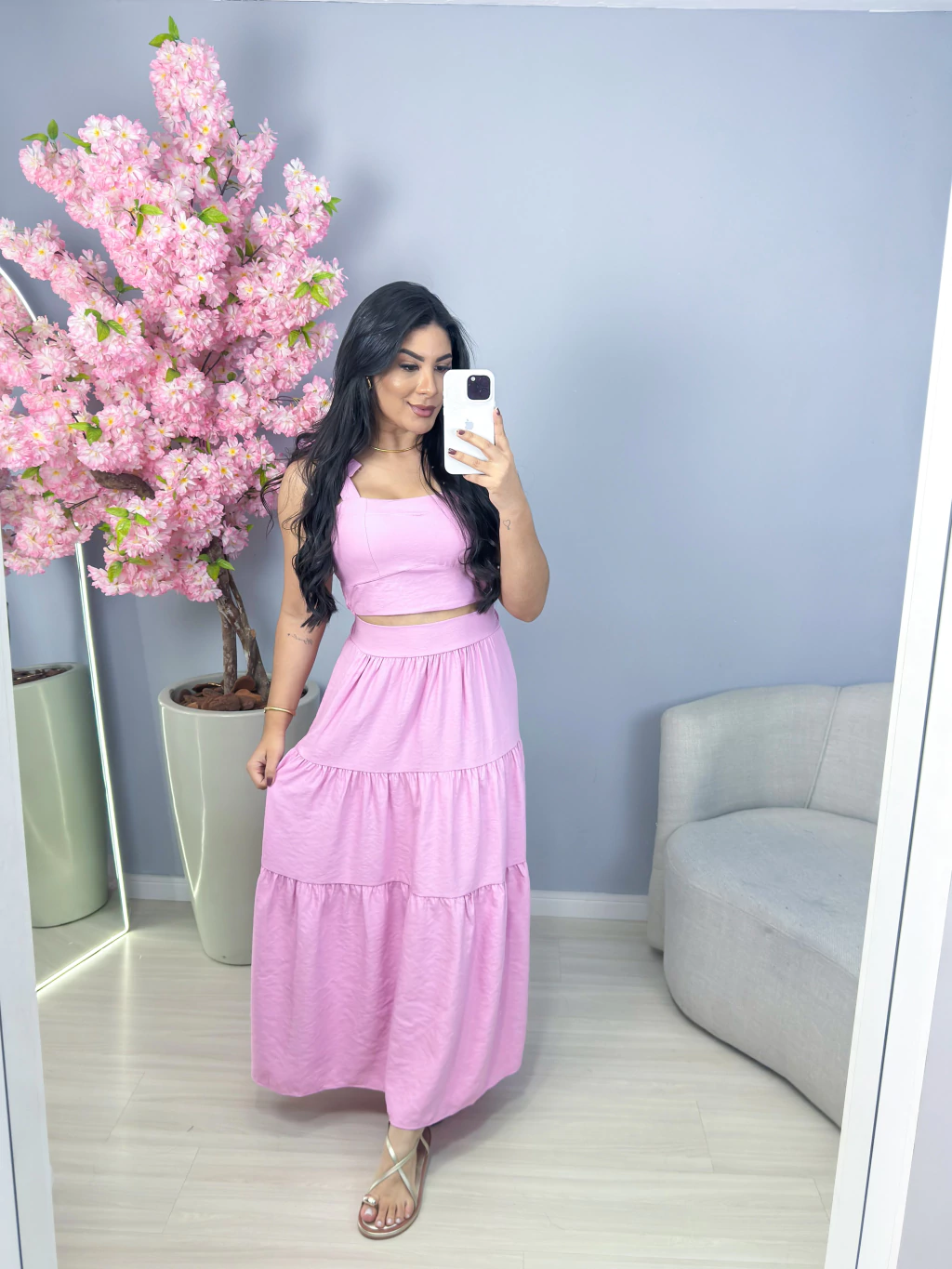 Este conjunto é composto por um cropped e uma saia longa, ideal para composições versáteis e estilosas.