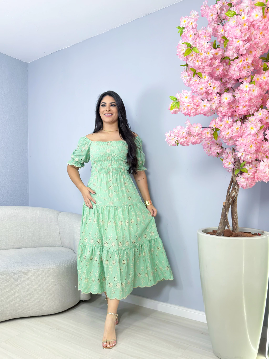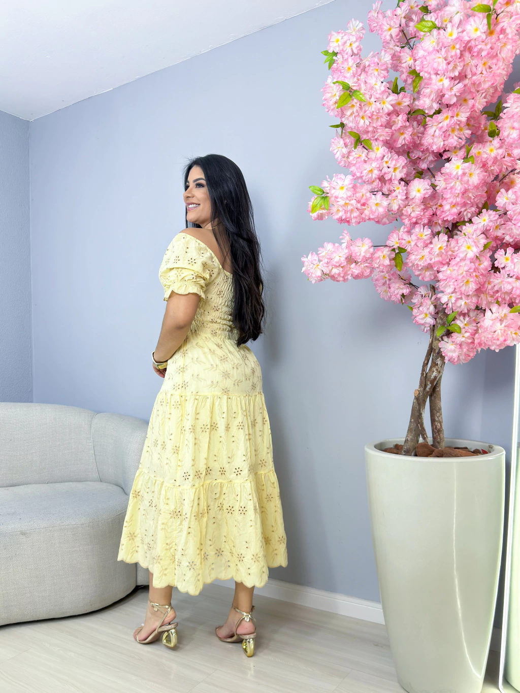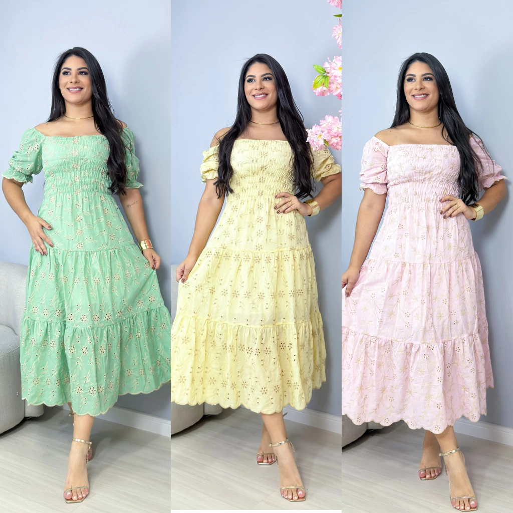 Este vestido midi é a escolha certa para quem busca uma peça leve, versátil e cheia de estilo para o dia a dia ou ocasiões especiais. O tecido lese proporciona um toque delicado e o lastex garante conforto durante o uso prolongado.